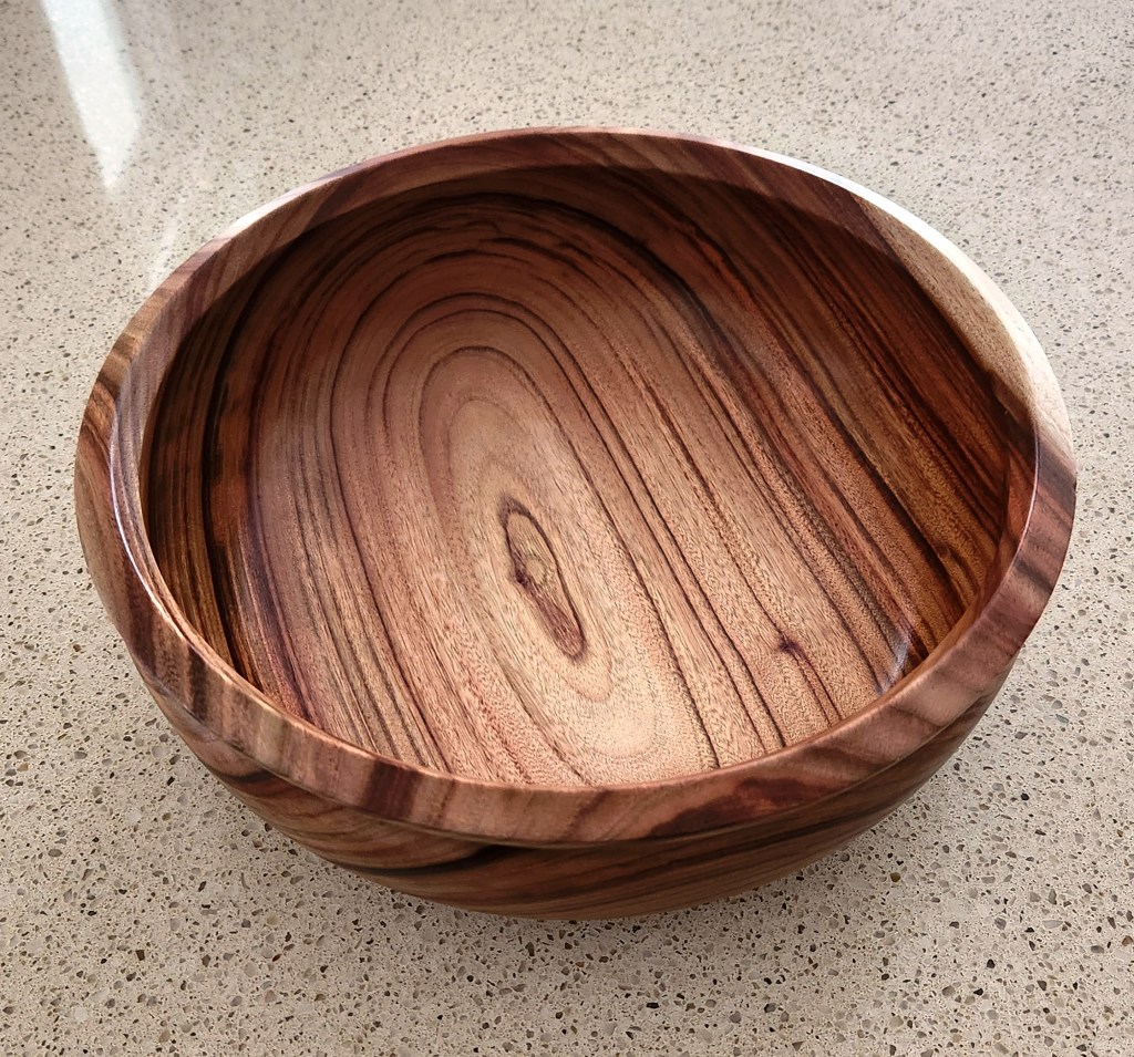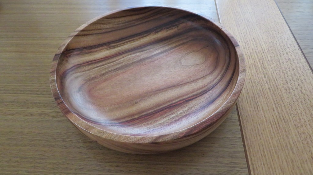 Janine is the happy recipient of this lovely platter. It’s the first one I have ever made this large and most of it was done at the Woodworkers Shed. The wood is African Mahogany or “Khaya” and it was difficult to sand down the end grain. In the end I had to sand by hand following the grain. The platter was finished with spray varnish.