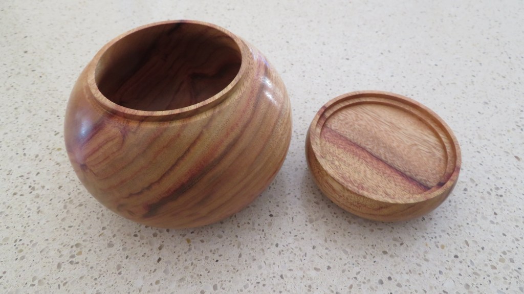 This bowl (container or jar) was turned as a “Cross Cut” piece from a block of Camphor Laurel in a training session at the club in April. In addition, the lid had two inlaid pieces carved into it as you can see from the first photo. The first inlay ended up as a 2mm ring and the second inlay is the top with completely different wood and a grain.
