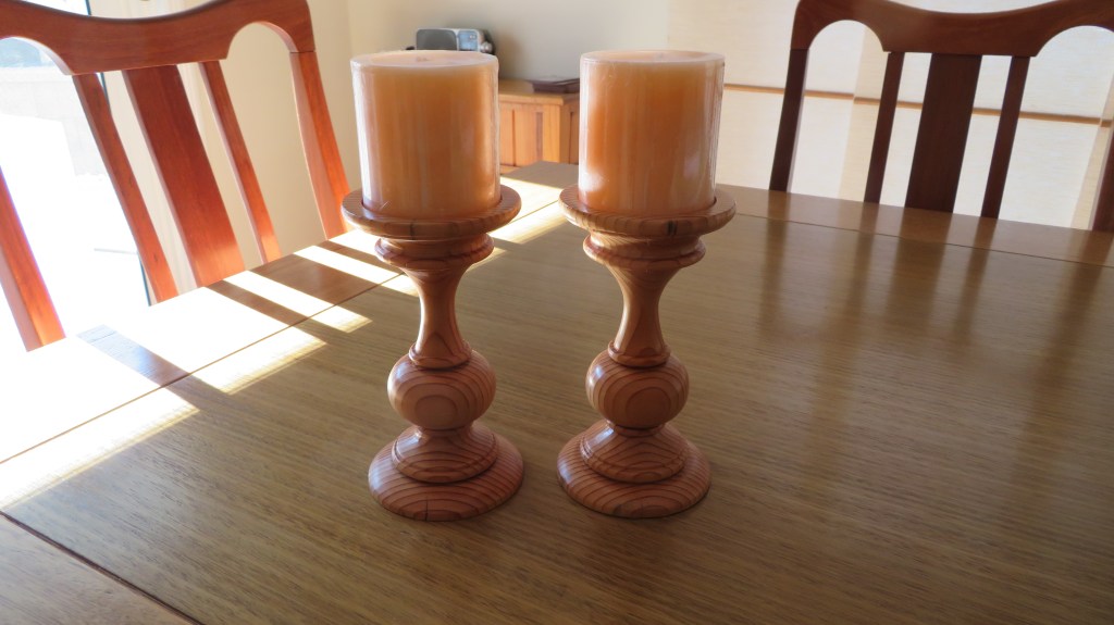 Twin Candle Holders turned from two Oregon Pianola legs. A friend of mine had an old Pianola that unfortunately had some weather damage. We pulled it apart and I salvaged the supporting legs which by now would have been around 50+ years old. Sadly it was wide grain Oregon, easy to turn but hard to finish smoothly. They make a great dinner table compliment for our next special occasion dinner. This won First prize at the Mudgeeraba show in June 2024.