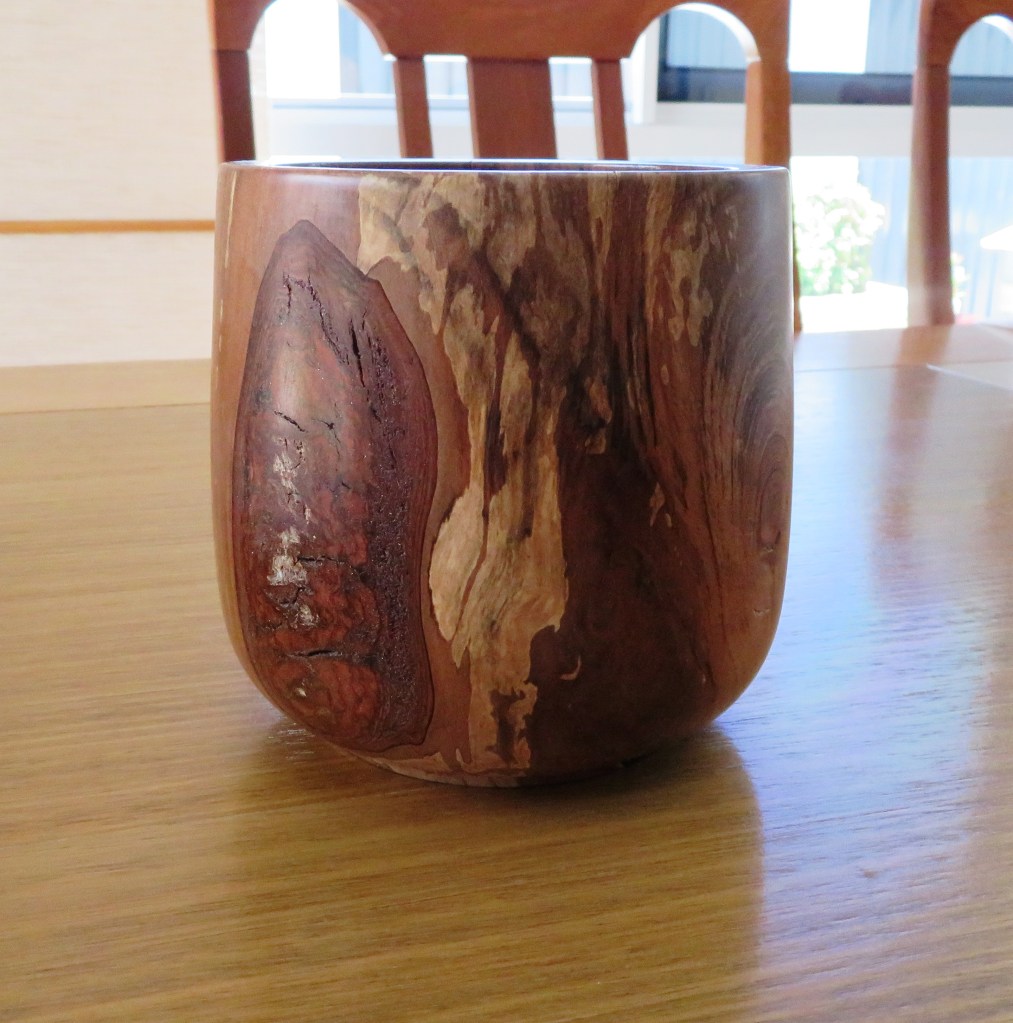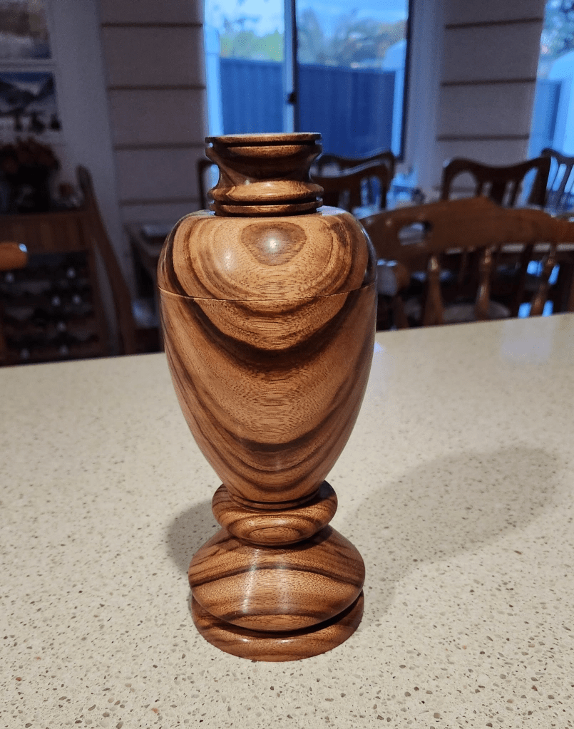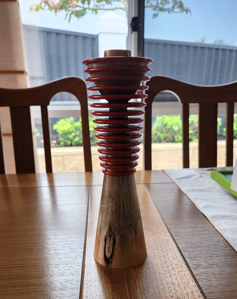 Early October ’24 and this idea of turning two shapes in one intrigued me. It turned out to be far more difficult than I imagined. Trying to get the paint all the way to the bottom of the deep cuts, without spilling onto the base – wow, that was touchy. After three attempts it didn’t turn out too bad. I inserted a candle holder into the top and it should look great on the dinner table and certainly a talking point. Made out of a rather plain piece of Camphor Laurel. To get the angles on the deep cuts I had to reshape a chisel each time. My woodturning buddy Steve, kindly lent me an old one he had tucked away. It was also awarded Third Prize in the Mudgeeraba Show for 2025.
