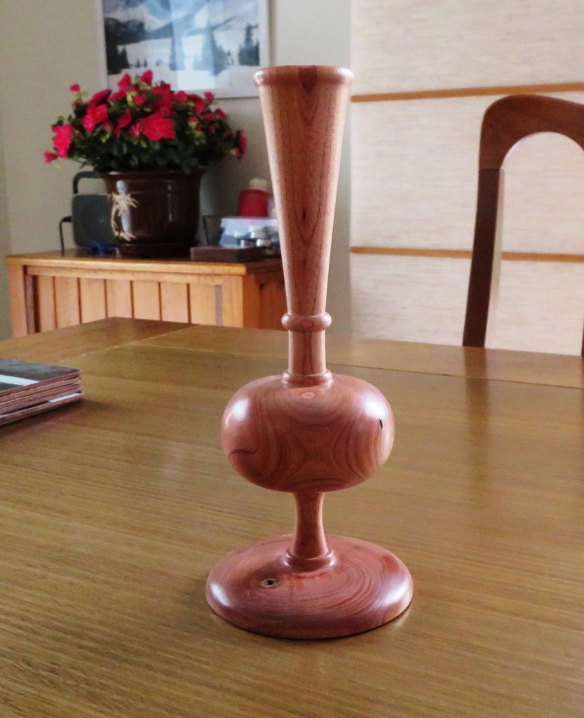 Mid October: We were watching an old movie the other night and in the background was this vase shape but it actually was a table lamp. I paused the movie and took a poor quality photo, then scaled it up to 200mm high and drew the model on Sketchup program. It took 2 weeks to turn and polish. The wood is Australian Red Cedar which it quite grainy and porous. I sanded it down to 600 grit then polished it with Carnauba Wax – 2 coats. It was a beautiful smooth finish. Carnauba wax comes from the fronds of a carnauba tree, found in Brazil. The trees’ leaves are dried and beaten to release the wax, which is then bleached or refined for a variety of uses. This harvesting process doesn’t harm the tree, and because of its source, carnauba wax is categorized as a natural plant wax.
