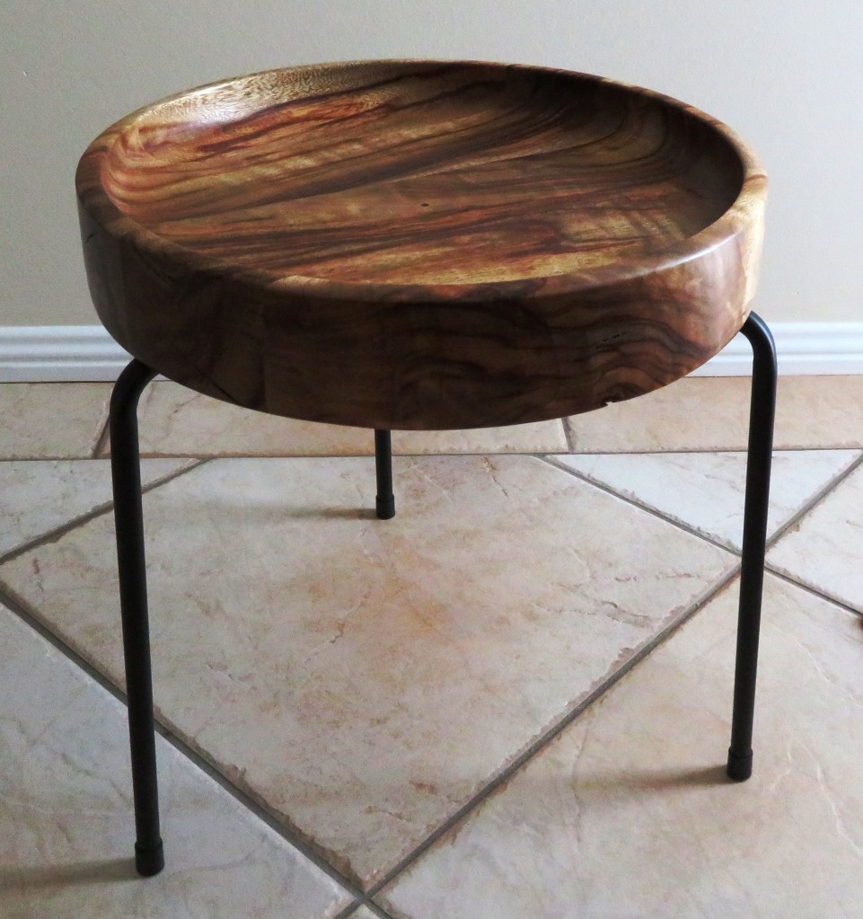 Mid November and this is a Camphor Laurel Bedside Table. The top doubles as a platter or a shallow fruit bowl. It consists of 5 pieces of Camphor Laurel glued together then turned as I didn’t have a single piece of wood large enough to fit the stand. It’s very solid and lots of texture.