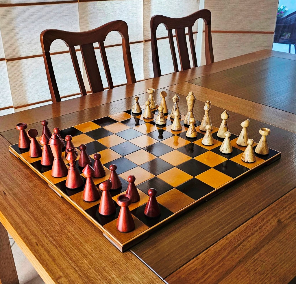 A completely new design for a chess set inspired by Nina, a lovely lady who herself is renowned in the ‘weaving’ world. The white pieces were made from Hoop Pine with spalting through each piece to really give them character. The Dark pieces were turned from Red Gum. The board is put together from pieces of MDF cut into 65mm squares so it is a rather large version of a chess set. As a guide, competition chess is usually played on a 57mm – 60mm board so this set is about a third larger and a lot more enjoyable to play with. I started designing this set in July and it was a celebration to finish it mid November ’24.